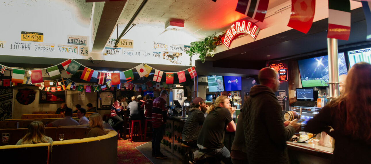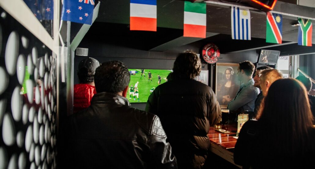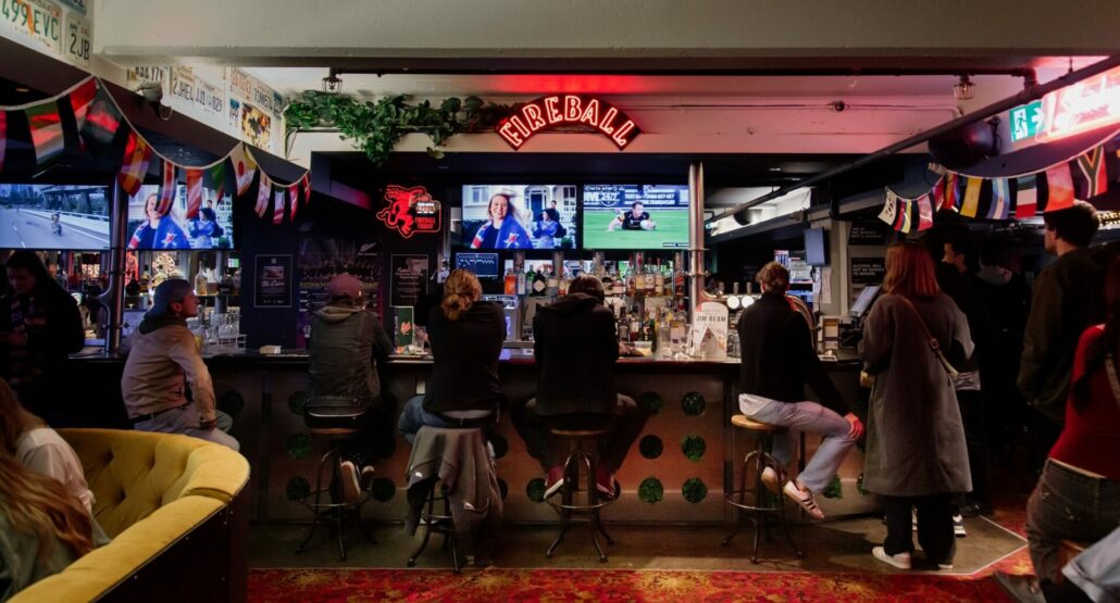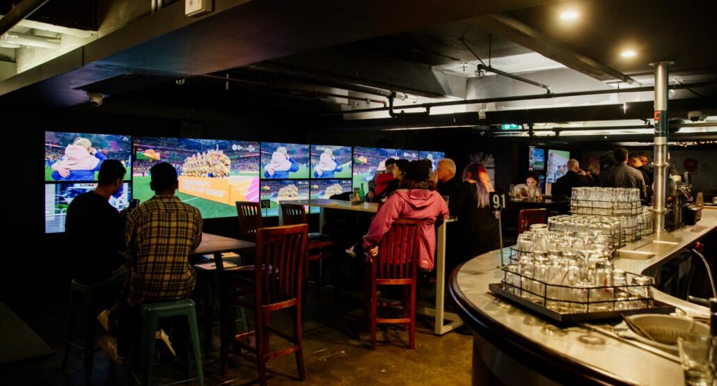 10+ strong TV wall, with direct bar access.